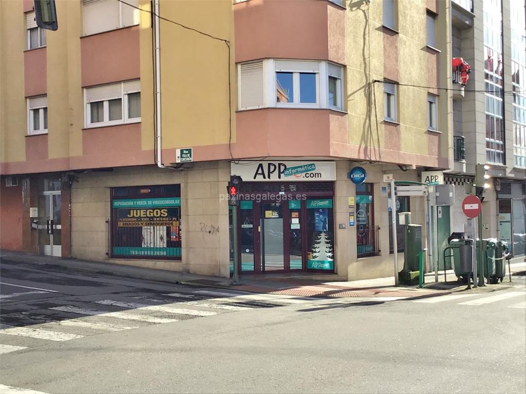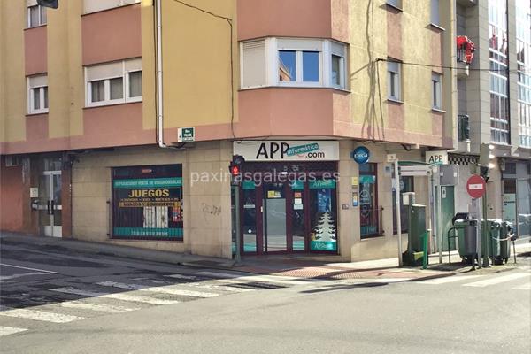 Además, en la parte visual la imagen principal identificativa de APP Informática, el visualizador de streetview con la vista de la calle Gran Vía, 136 Bajo (Esq. Vila de Corcubión) - 15100 y sus cercanias.