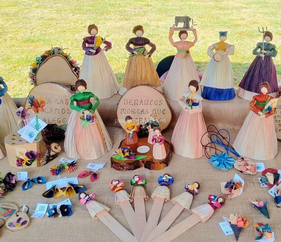 Artesanía de Galicia feita con folla de millo. Dispoñemos dunha gran variedade de productos: bonecas, flores para xarróns, complementos para o pelo, broches, imáns, sombreiros, chaveiros, veleiros... Fanse detalles para bodas e eventos familiares e empresariais.