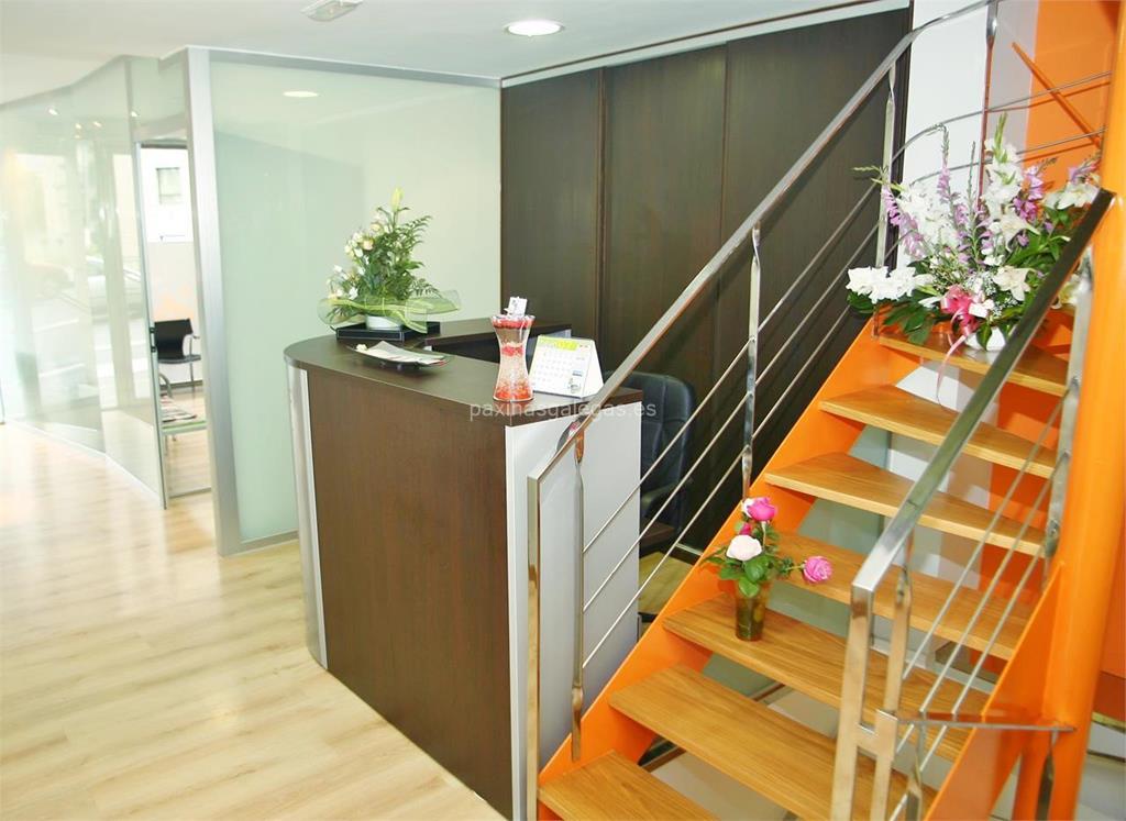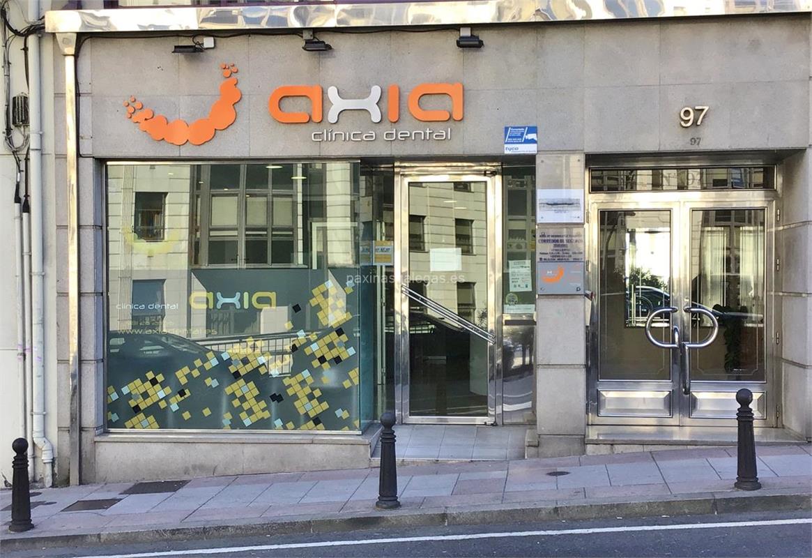 Además, en la parte visual se muestra el logotipo corporativo, la imagen principal identificativa de Axia Clínica Dental, el visualizador de streetview con la vista de la calle Avda. de Finisterre, 97 Bajo - 15004 y sus cercanias. 14 imágenes adicionales relativas a los productos, trabajos, servicios de Axia Clínica Dental.