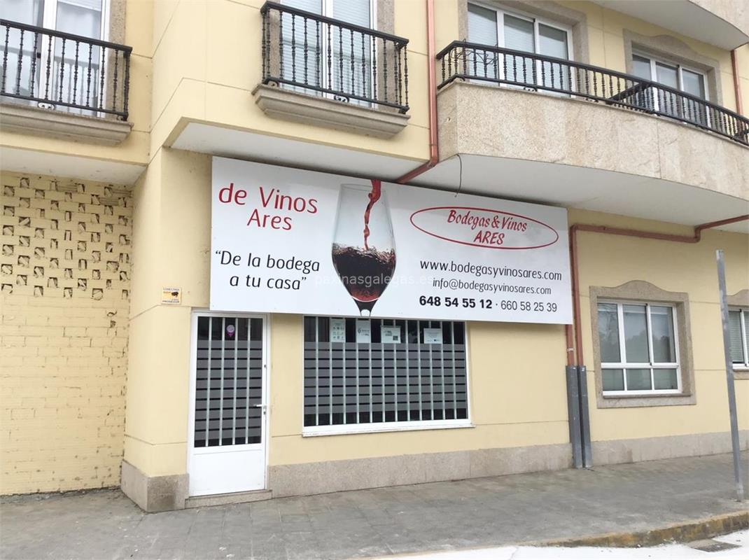 Los datos de contacto: el teléfono de Bodegas y Vinos Ares (principal) asi como la calle y dirección completa (Concepción Arenal, 49 - 15624) dentro de Ares o la ubicación gps en el mapa (tambien como llegar), enlaces a la pagina web (web empresa, facebook) y el correo electrónico (email) para ponerse en contacto can Bodegas y Vinos Ares a través de email.