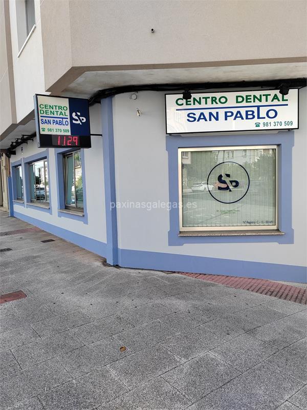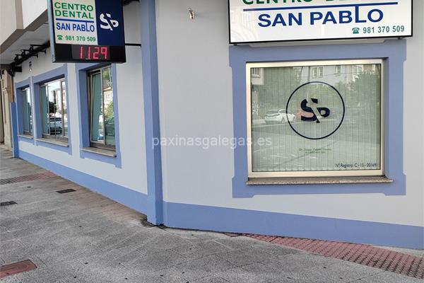 Además, en la parte visual se muestra el logotipo corporativo, la imagen principal identificativa de Centro Dental San Pablo, el visualizador de streetview con la vista de la calle Rúa do Carballo, 1 Bajo - 15405 y sus cercanias. 4 imágenes adicionales relativas a los productos, trabajos, servicios de Centro Dental San Pablo.
