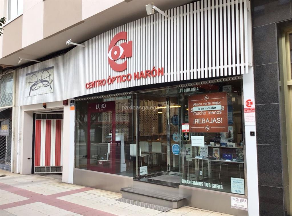 Además, en la parte visual la imagen principal identificativa de Centro Óptico Naron, el visualizador de streetview con la vista de la calle Estr. de Castela, 119 - 15570 y sus cercanias.