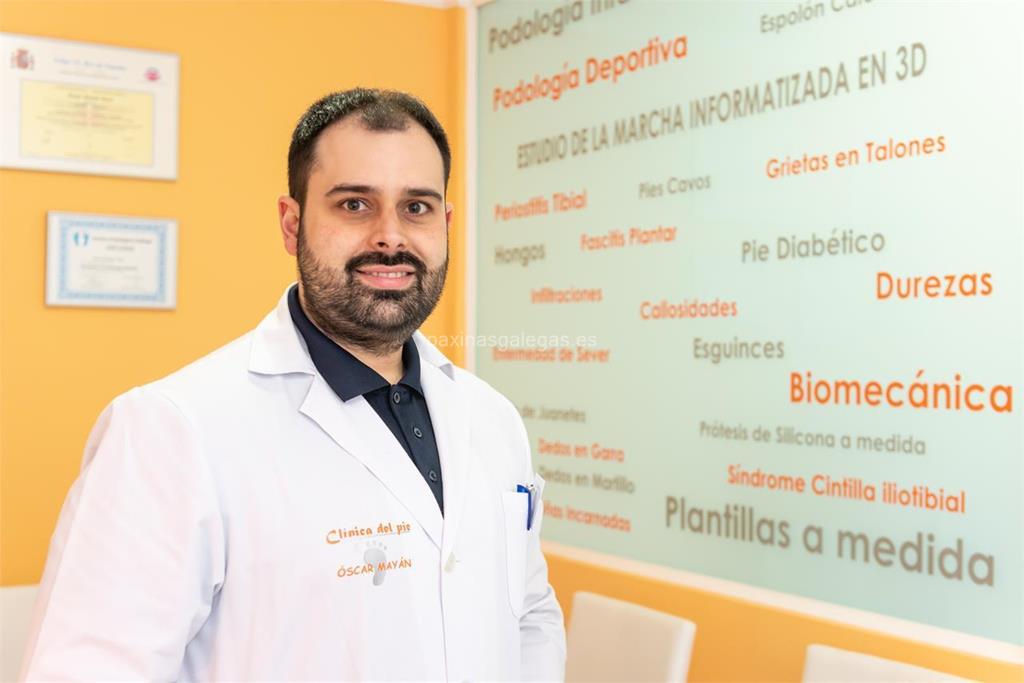 Además, en la parte visual se muestra el logotipo corporativo, la imagen principal identificativa de Clínica del Pie Óscar Mayán, el visualizador de streetview con la vista de la calle Robustiano Pérez del Río, 12 1ºA - 15930 y sus cercanias. 20 imágenes adicionales relativas a los productos, trabajos, servicios de Clínica del Pie Óscar Mayán.