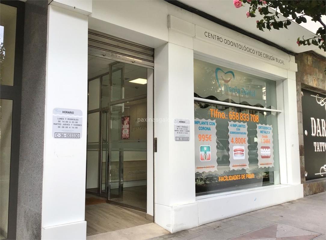 Tambien podrá encontrar el horario de atención apertura. Los datos de contacto: el teléfono de Diseña Dental (principal) asi como la calle y dirección completa (Avda. Camelias, 108 - 36211) dentro de Vigo zona (As Travesas - Plaza Independencia) o la ubicación gps en el mapa (tambien como llegar), enlaces a la pagina web (web empresa, instagram, facebook) y el correo electrónico (email) para ponerse en contacto can Diseña Dental a través de email.