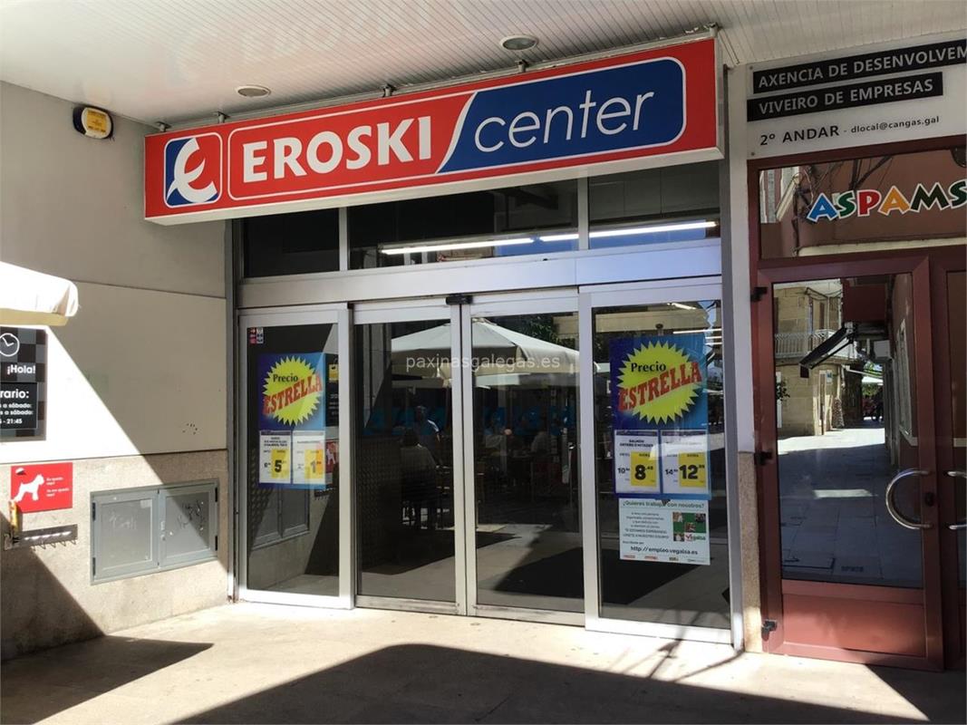 Tambien podrá encontrar el horario de atención apertura. Los datos de contacto: el teléfono de Eroski Center (principal) asi como la calle y dirección completa (Eirado do Señal, 5 - 36940) dentro de Cangas o la ubicación gps en el mapa (tambien como llegar), enlaces a la pagina web (web empresa, web franquicia, instagram, facebook, x, youtube, linkedin).