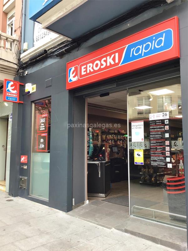 Tambien podrá encontrar el horario de atención apertura. Los datos de contacto: el teléfono de Eroski Rapid (principal) asi como la calle y dirección completa (Juan Flórez, 8 - 15004) dentro de A Coruña zona (Juan Flórez) o la ubicación gps en el mapa (tambien como llegar), enlaces a la pagina web (web empresa, instagram, facebook, x, youtube, linkedin).