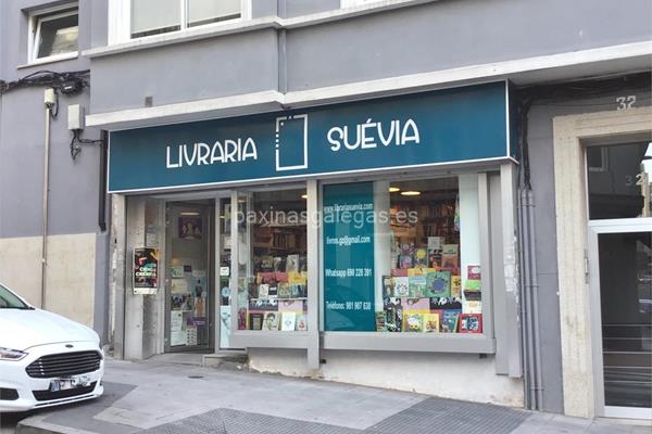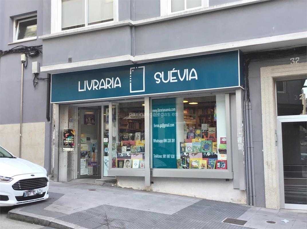 Además, en la parte visual la imagen principal identificativa de Livraria Suévia, el visualizador de streetview con la vista de la calle Villa de Negreira, 32 - 15011 y sus cercanias.