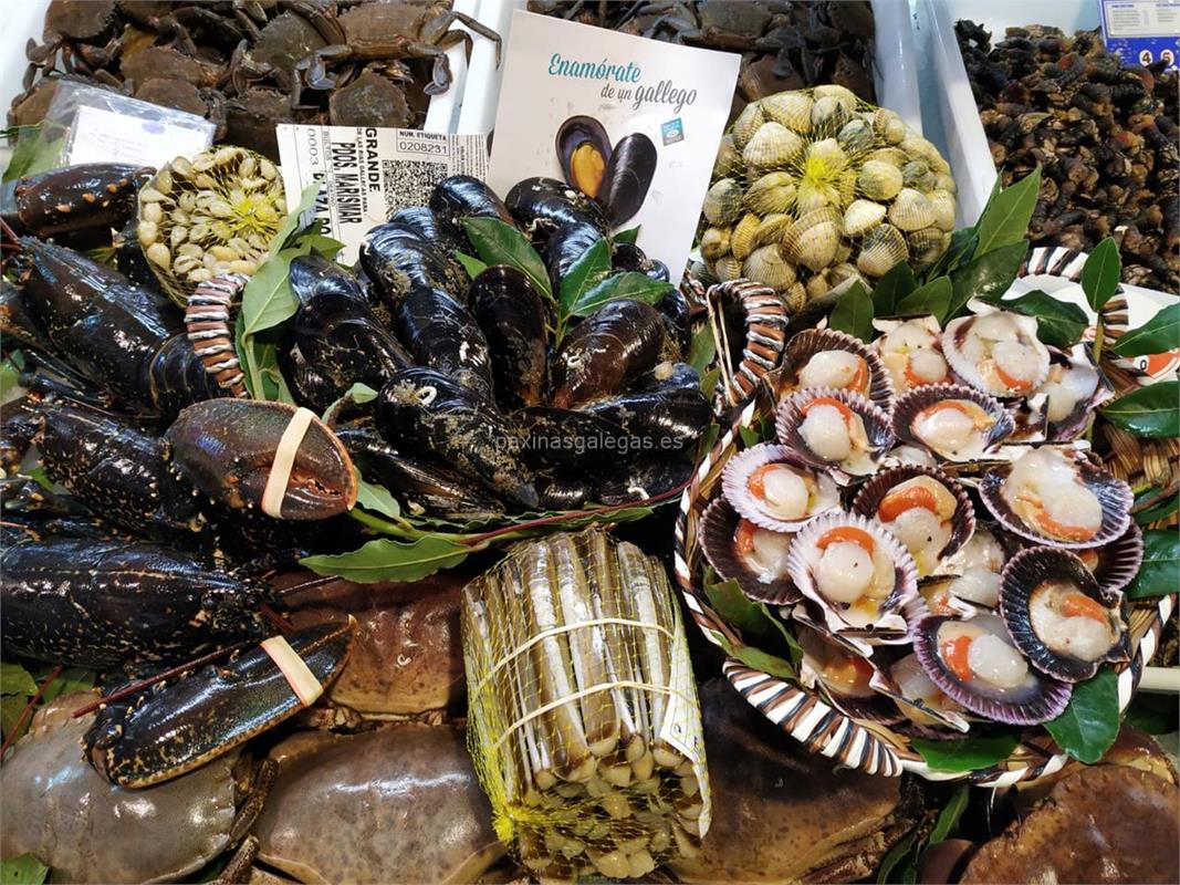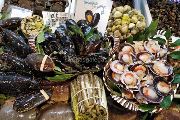 Pescados y mariscos. Centollas, percebes, merluza, mejillones, langosta, cigalas, sepia, buey de mar, navajas, rodaballo, almejas, vieiras, pulpo, nécoras, lenguado, berberechos, sardinas, doradas, jureles, sargo, acedía, lubina, langostinos, etc.