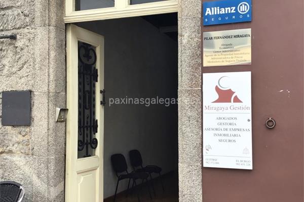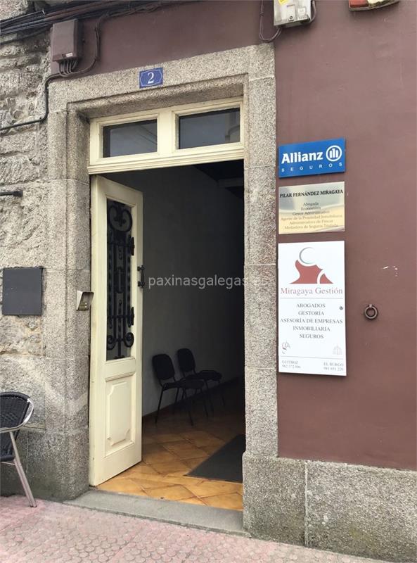 Además, en la parte visual la imagen principal identificativa de Miragaya Gestión (Allianz), el visualizador de streetview con la vista de la calle Concello, 2 1º D - 27300 y sus cercanias.