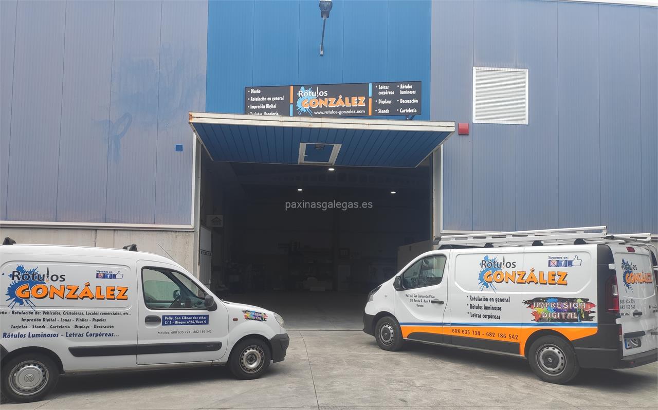 Además, en la parte visual se muestra el logotipo corporativo, la imagen principal identificativa de Rótulos González, el visualizador de streetview con la vista de la calle Calle 3, 26 Nave 4 - Polígono San Cibrao - 32901 y sus cercanias. 13 imágenes adicionales relativas a los productos, trabajos, servicios de Rótulos González.
