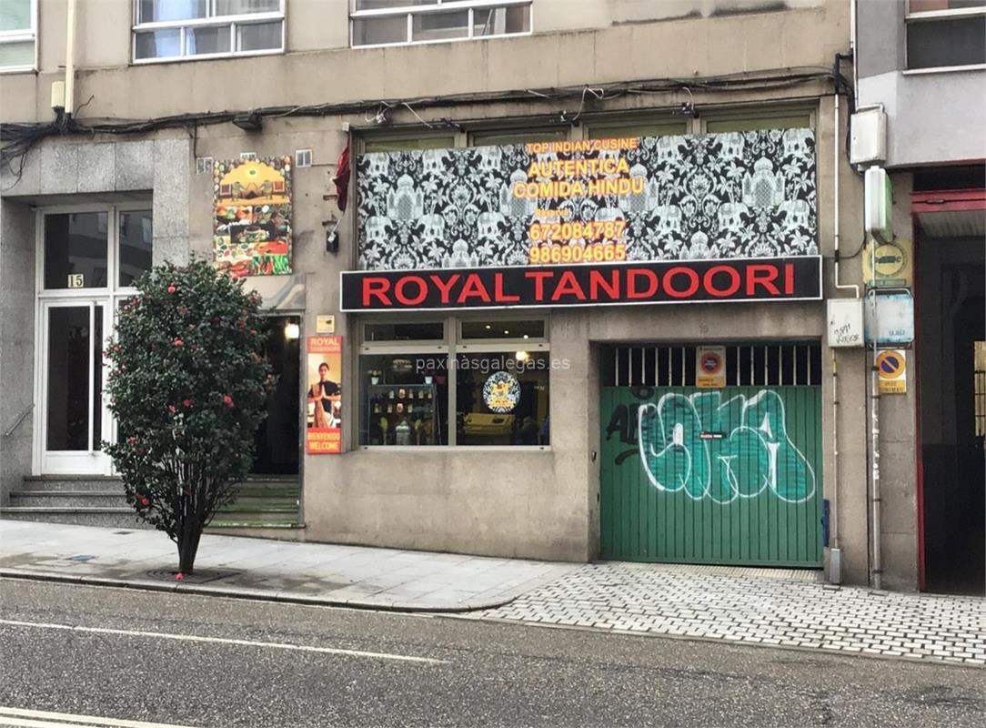 Además, en la parte visual la imagen principal identificativa de Royal Tandoori Indian, el visualizador de streetview con la vista de la calle Rúa da Coruña, 15 - 36208 y sus cercanias.