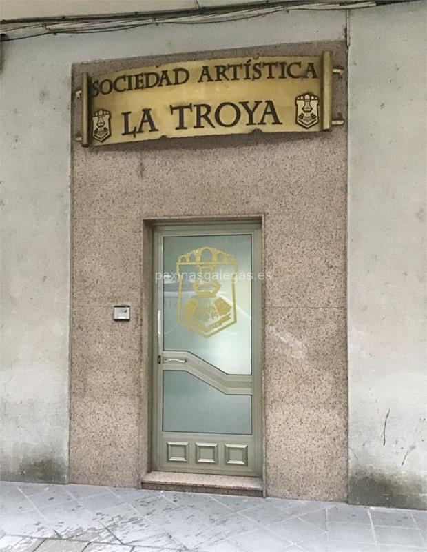 Además, en la parte visual la imagen principal identificativa de Sociedad Artística La Troya, el visualizador de streetview con la vista de la calle Ribeira de Canedo, 2 Bajo - 32001 y sus cercanias.