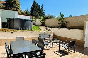 Apartamento que cuenta con dos dormitorios, uno con dos camas individuales y el otro con cama doble, cocina totalmente equipada, sala de estar con sofá cama, televisión, microondas, lavadora, dos baños con ducha, piscina, jardín y terraza.