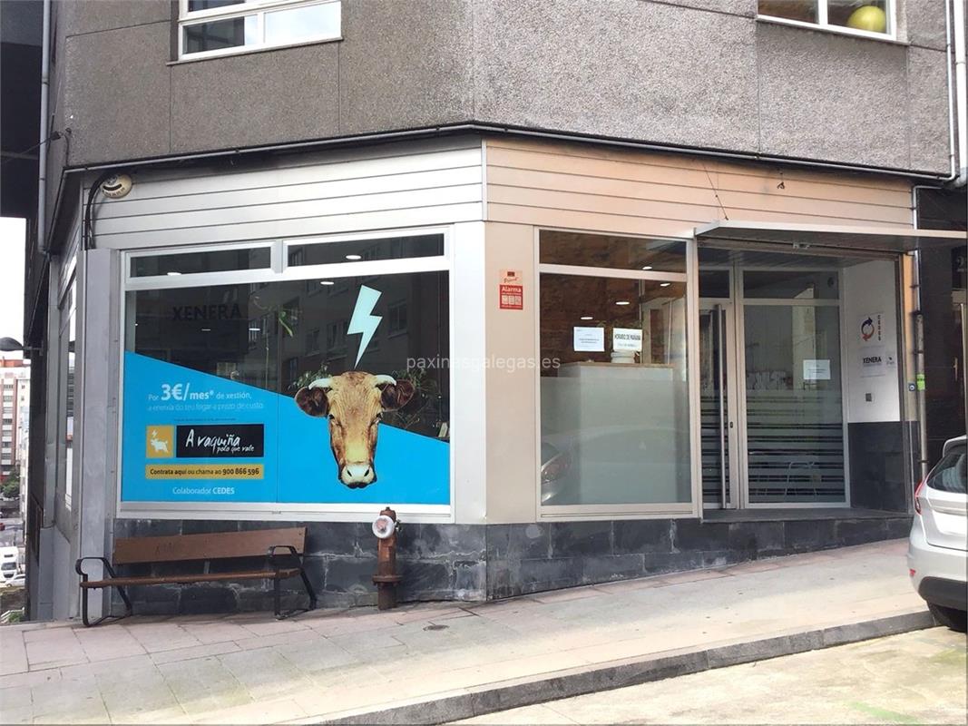 Además, en la parte visual la imagen principal identificativa de Xenera (A Vaquiña Polo Que Vale), el visualizador de streetview con la vista de la calle Falperra, 23 Bajo - 15005 y sus cercanias.