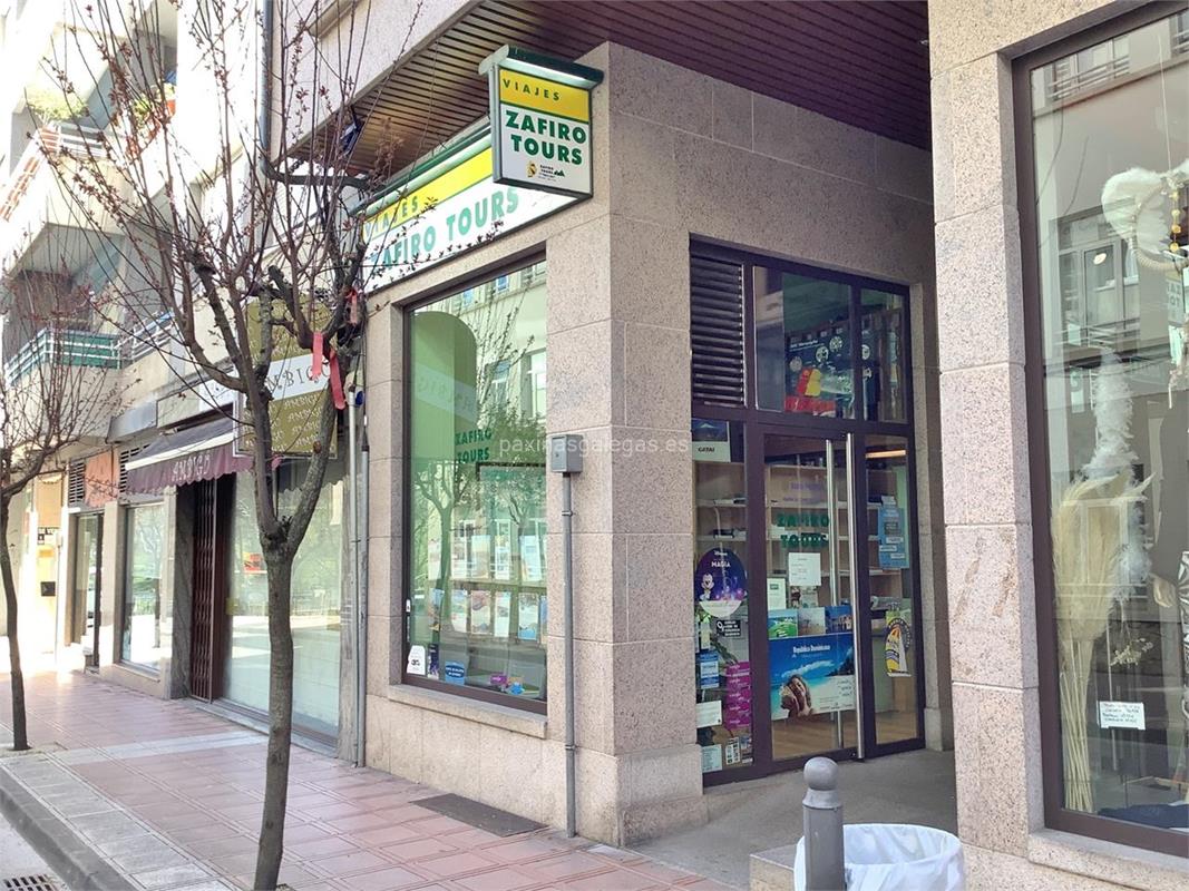 Además, en la parte visual la imagen principal identificativa de Zafiro Tours, el visualizador de streetview con la vista de la calle Avda. A Estación, 3 Bajo - 32300 y sus cercanias.